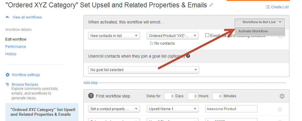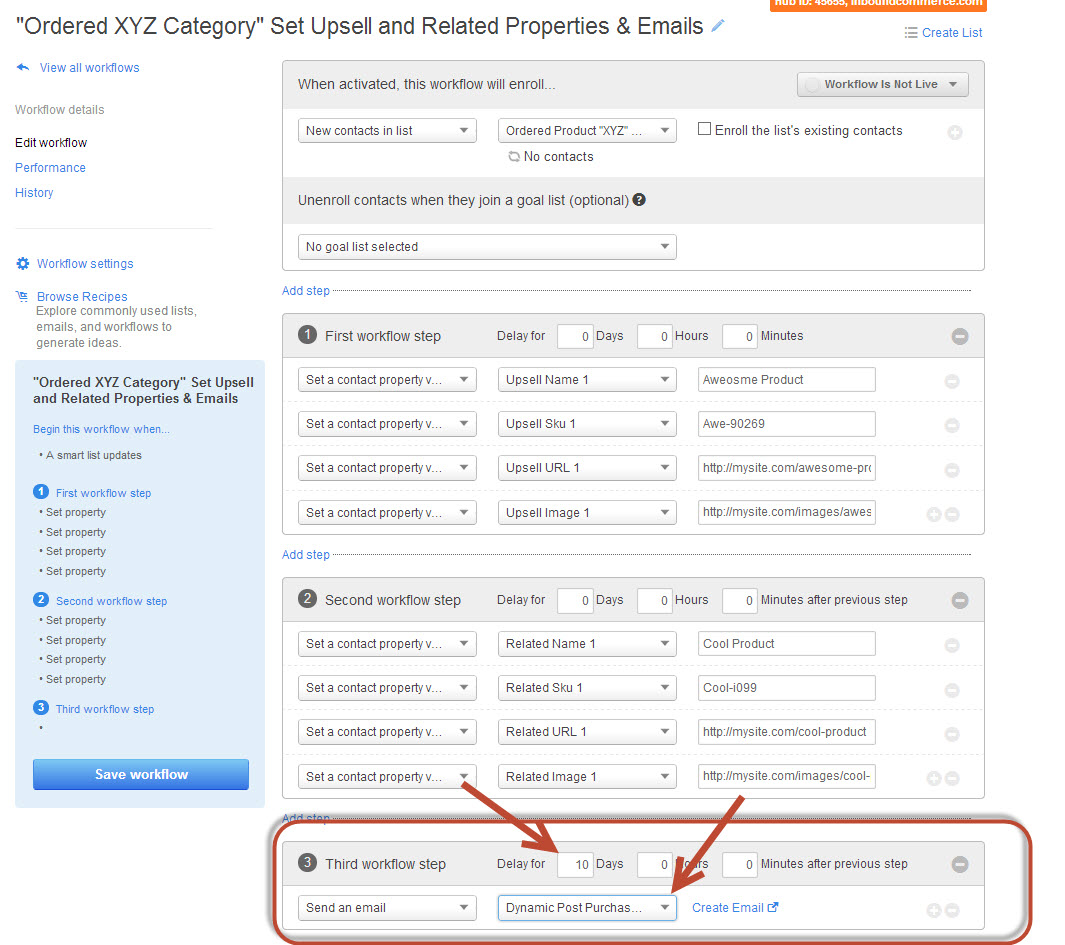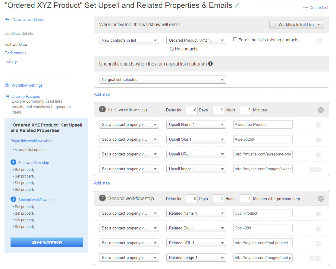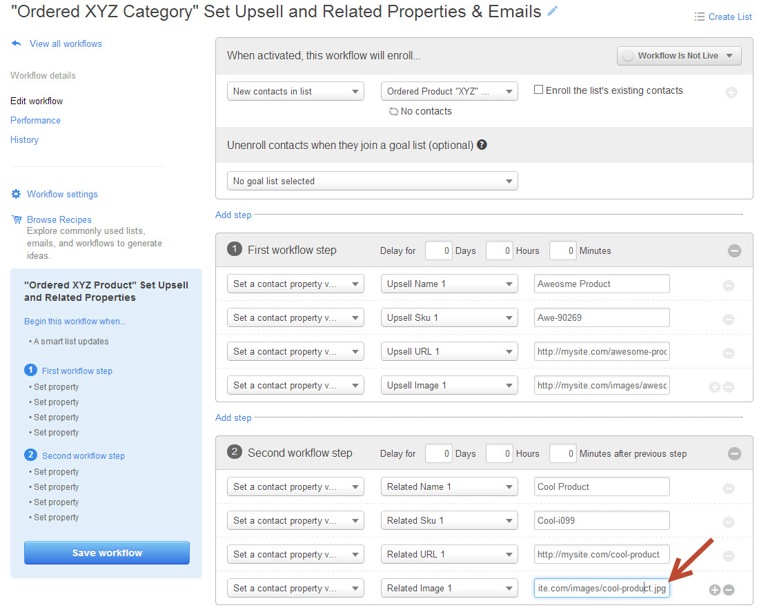 Indicate to HubSpot what should be included in the Upsell and Related Product fields through the workflow automation tool by setting these contact properties. We will use these contact properties in the dynamic email template.